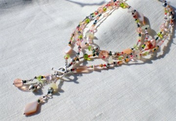 Kæden er sammensat af sten og perler i rosa, lys grøn og